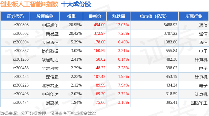 创业板人工智能R(470070)指数十大成份股详情如下: