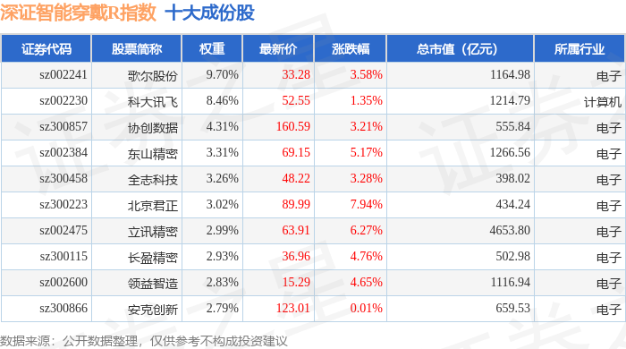 深证智能穿戴R(470074)指数十大成份股详情如下: