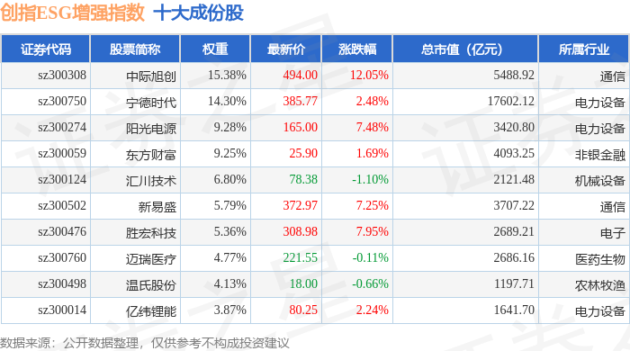 证券之星消息,10月24日,创指ESG增强(970034)指数报收于2981.91点,涨4.5%,成交1445.4亿元,换手率2.17%。当日该指数成份股中,上涨的有30家,中际旭创以12.05%的涨幅领涨,下跌的有10家,蓝晓科技以3.93%的跌幅领跌。