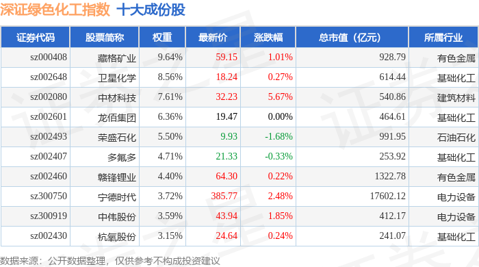 证券之星消息,10月24日,深证绿色化工(970076)指数报收于1568.1点,涨0.86%,成交416.24亿元,换手率1.9%。当日该指数成份股中,上涨的有24家,晶瑞电材以8.29%的涨幅领涨,下跌的有24家,凯盛新材以4.64%的跌幅领跌。
