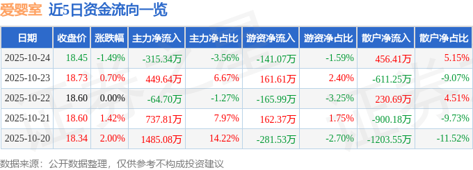 证券之星消息,截至2025年10月24日收盘,爱婴室(603214)报收于18.45元,下跌1.49%,换手率3.45%,成交量4.77万手,成交额8869.53万元。