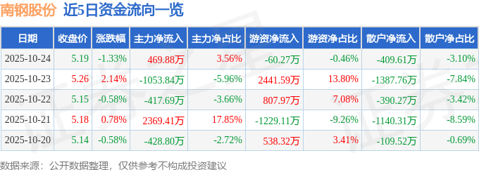 证券之星消息,截至2025年10月24日收盘,南钢股份(600282)报收于5.19元,下跌1.33%,换手率0.41%,成交量25.36万手,成交额1.32亿元。