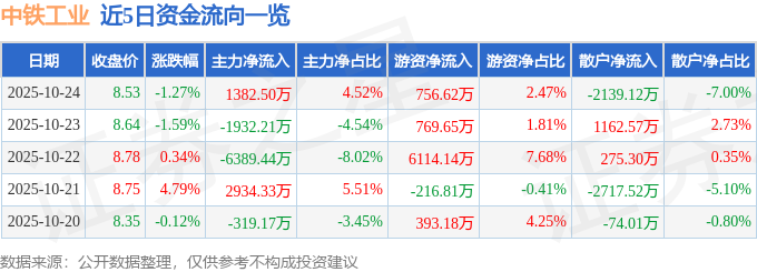 证券之星消息,截至2025年10月24日收盘,中铁工业(600528)报收于8.53元,下跌1.27%,换手率1.61%,成交量35.77万手,成交额3.06亿元。
