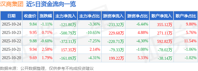 证券之星消息,截至2025年10月24日收盘,汉商集团(600774)报收于9.84元,下跌1.11%,换手率1.24%,成交量3.67万手,成交额3624.41万元。