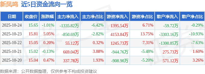 证券之星消息,截至2025年10月24日收盘,新凤鸣(603225)报收于15.65元,下跌1.01%,换手率0.88%,成交量13.35万手,成交额2.08亿元。