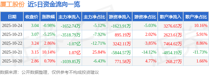证券之星消息,截至2025年10月24日收盘,厦工股份(600815)报收于3.04元,下跌0.98%,换手率5.88%,成交量104.31万手,成交额3.23亿元。