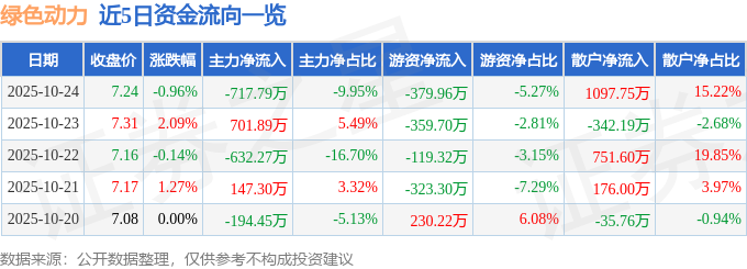 证券之星消息,截至2025年10月24日收盘,绿色动力(601330)报收于7.24元,下跌0.96%,换手率1.01%,成交量9.96万手,成交额7213.04万元。