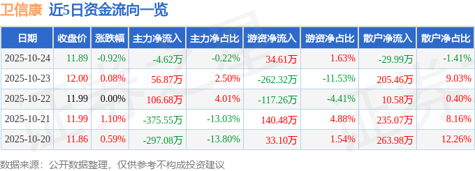 证券之星消息,截至2025年10月24日收盘,卫信康(603676)报收于11.89元,下跌0.92%,换手率0.41%,成交量1.78万手,成交额2124.06万元。