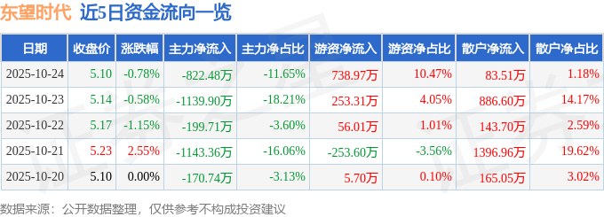 证券之星消息,截至2025年10月24日收盘,东望时代(600052)报收于5.1元,下跌0.78%,换手率1.64%,成交量13.8万手,成交额7058.31万元。