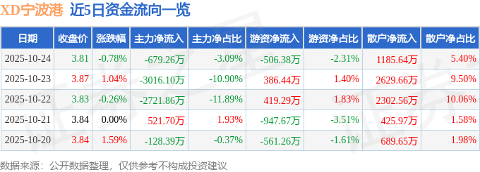 证券之星消息,截至2025年10月24日收盘,XD宁波港(601018)报收于3.81元,下跌0.78%,换手率0.3%,成交量57.5万手,成交额2.2亿元。