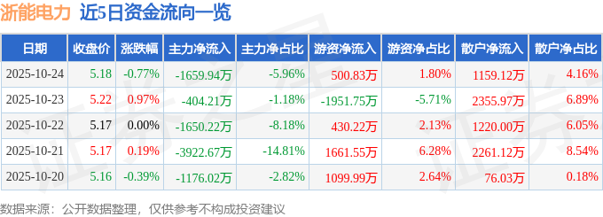 证券之星消息,截至2025年10月24日收盘,浙能电力(600023)报收于5.18元,下跌0.77%,换手率0.4%,成交量53.67万手,成交额2.78亿元。