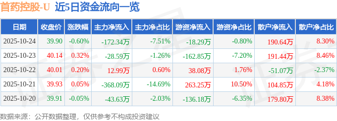 证券之星消息,截至2025年10月24日收盘,首药控股(688197)报收于39.9元,下跌0.6%,换手率0.9%,成交量5736.0手,成交额2296.35万元。