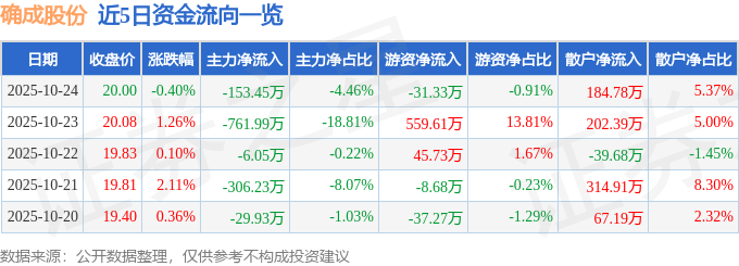 证券之星消息,截至2025年10月24日收盘,确成股份(605183)报收于20.0元,下跌0.4%,换手率0.42%,成交量1.72万手,成交额3439.54万元。
