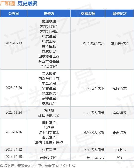 证券之星消息,根据天眼查APP于10月13日公布的信息整理,深圳市广和通无线股份有限公司基石投资轮融资,融资额约12.53亿港元,参与投资的机构包括勤道赣通,太平洋资产,太平洋保险,广发基金,广发国际,瑞华控股,智度股份,国泰海通证券,君宜香港基金,个人投资者。