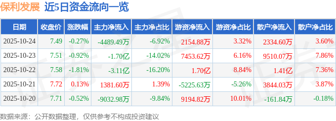 证券之星消息,截至2025年10月24日收盘,保利发展(600048)报收于7.49元,下跌0.27%,换手率0.72%,成交量86.63万手,成交额6.49亿元。