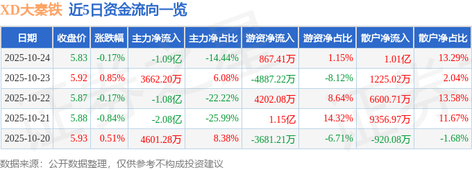 证券之星消息,截至2025年10月24日收盘,XD大秦铁(601006)报收于5.83元,下跌0.17%,换手率0.64%,成交量129.68万手,成交额7.56亿元。