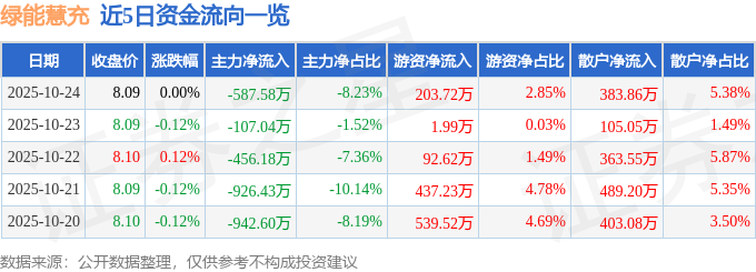 10月24日的资金流向数据方面,主力资金净流出587.58万元,占总成交额8.23%,游资资金净流入203.72万元,占总成交额2.85%,散户资金净流入383.86万元,占总成交额5.38%。