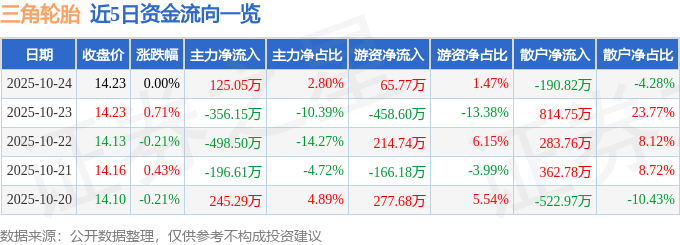证券之星消息,截至2025年10月24日收盘,三角轮胎(601163)报收于14.23元,上涨0.0%,换手率0.39%,成交量3.13万手,成交额4459.09万元。