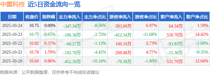 证券之星消息,截至2025年10月24日收盘,中重科技(603135)报收于10.75元,上涨0.0%,换手率1.49%,成交量3.77万手,成交额4057.35万元。
