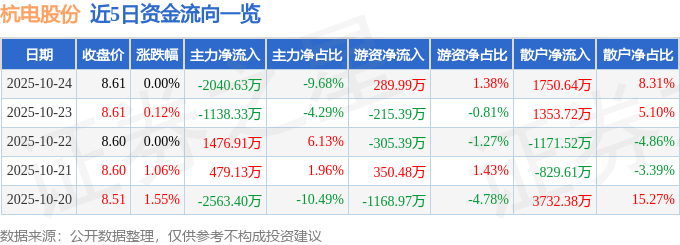证券之星消息,截至2025年10月24日收盘,杭电股份(603618)报收于8.61元,上涨0.0%,换手率3.54%,成交量24.48万手,成交额2.11亿元。