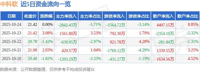 证券之星消息,截至2025年10月24日收盘,中科软(603927)报收于21.42元,上涨0.0%,换手率2.78%,成交量23.13万手,成交额4.98亿元。