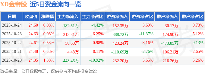 10月24日的资金流向数据方面,主力资金净流出182.51万元,占总成交额4.42%,游资资金净流入152.35万元,占总成交额3.69%,散户资金净流入30.17万元,占总成交额0.73%。