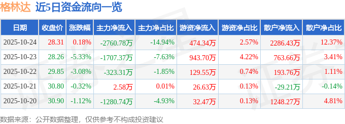 证券之星消息,截至2025年10月24日收盘,格林达(603931)报收于28.31元,上涨0.18%,换手率3.25%,成交量6.49万手,成交额1.85亿元。
