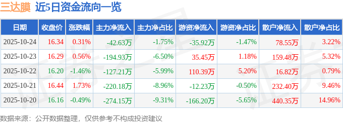 证券之星消息,截至2025年10月24日收盘,三达膜(688101)报收于16.34元,上涨0.31%,换手率0.45%,成交量1.49万手,成交额2437.74万元。