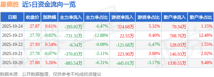 证券之星消息,截至2025年10月24日收盘,星德胜(603344)报收于27.87元,上涨0.61%,换手率4.06%,成交量2.2万手,成交额6103.89万元。