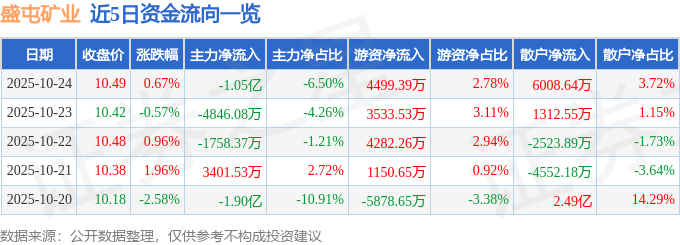 证券之星消息,截至2025年10月24日收盘,盛屯矿业(600711)报收于10.49元,上涨0.67%,换手率5.0%,成交量154.51万手,成交额16.16亿元。