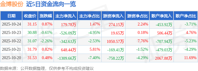 证券之星消息,截至2025年10月24日收盘,金博股份(688598)报收于31.15元,上涨0.87%,换手率1.93%,成交量3.92万手,成交额1.22亿元。