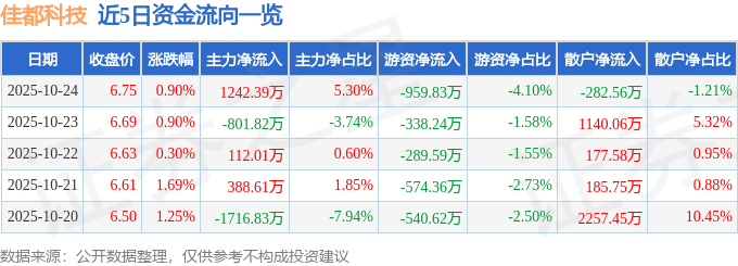 证券之星消息,截至2025年10月24日收盘,佳都科技(600728)报收于6.75元,上涨0.9%,换手率1.64%,成交量34.93万手,成交额2.34亿元。