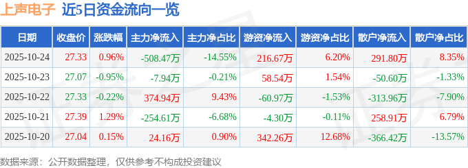 证券之星消息,截至2025年10月24日收盘,上声电子(688533)报收于27.33元,上涨0.96%,换手率0.79%,成交量1.28万手,成交额3493.93万元。