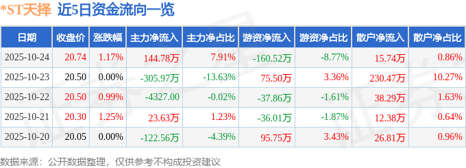 证券之星消息,截至2025年10月24日收盘,*ST天择(603721)报收于20.74元,上涨1.17%,换手率0.68%,成交量8854.0手,成交额1830.18万元。