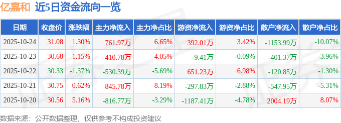 证券之星消息,截至2025年10月24日收盘,亿嘉和(603666)报收于31.08元,上涨1.3%,换手率1.8%,成交量3.69万手,成交额1.15亿元。