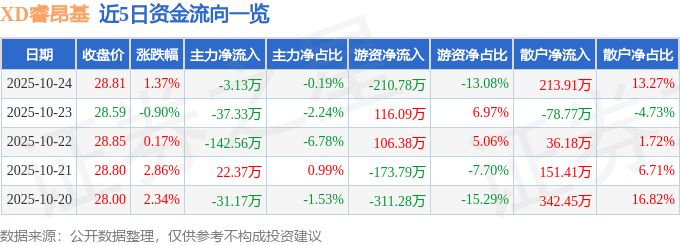 证券之星消息,截至2025年10月24日收盘,XD睿昂基(688217)报收于28.81元,上涨1.37%,换手率1.0%,成交量5592.0手,成交额1611.68万元。