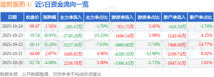 证券之星消息,截至2025年10月24日收盘,迪哲医药(688192)报收于60.47元,上涨1.56%,换手率0.62%,成交量2.79万手,成交额1.67亿元。