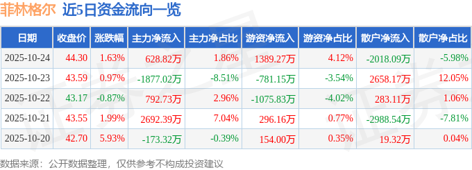 证券之星消息,截至2025年10月24日收盘,菲林格尔(603226)报收于44.3元,上涨1.63%,换手率2.13%,成交量7.56万手,成交额3.37亿元。