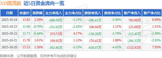 证券之星消息,截至2025年10月24日收盘,XD国茂股(603915)报收于15.82元,上涨2.2%,换手率0.94%,成交量6.16万手,成交额9674.97万元。