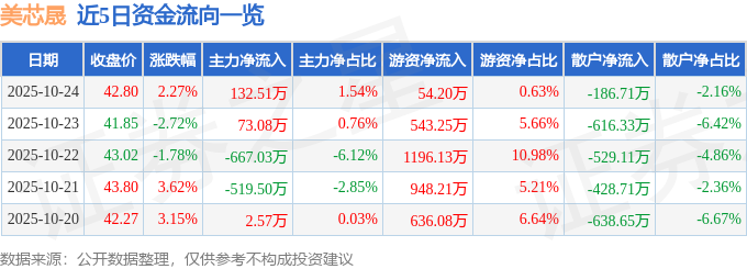 10月24日的资金流向数据方面,主力资金净流入132.51万元,占总成交额1.54%,游资资金净流入54.2万元,占总成交额0.63%,散户资金净流出186.71万元,占总成交额2.16%。