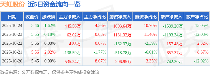 证券之星消息,截至2025年10月24日收盘,天虹股份(002419)报收于5.46元,下跌1.62%,换手率1.6%,成交量18.64万手,成交额1.02亿元。
