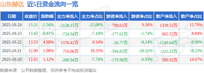 证券之星消息,截至2025年10月24日收盘,山东赫达(002810)报收于13.21元,下跌1.56%,换手率2.01%,成交量6.44万手,成交额8533.14万元。