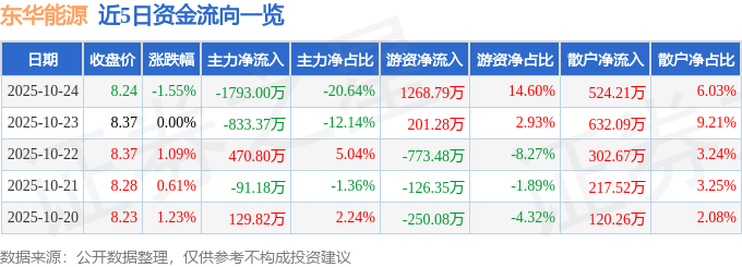证券之星消息,截至2025年10月24日收盘,东华能源(002221)报收于8.24元,下跌1.55%,换手率0.72%,成交量10.49万手,成交额8688.03万元。