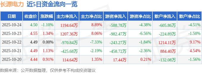 证券之星消息,截至2025年10月24日收盘,长源电力(000966)报收于4.5元,下跌1.1%,换手率0.91%,成交量29.78万手,成交额1.34亿元。
