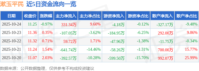 证券之星消息,截至2025年10月24日收盘,漱玉平民(301017)报收于11.25元,下跌0.97%,换手率1.26%,成交量3.06万手,成交额3452.49万元。