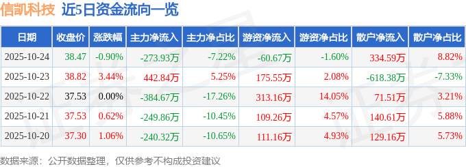 10月24日的资金流向数据方面,主力资金净流出273.93万元,占总成交额7.22%,游资资金净流出60.67万元,占总成交额1.6%,散户资金净流入334.59万元,占总成交额8.82%。