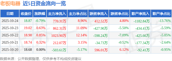 证券之星消息,截至2025年10月24日收盘,老板电器(002508)报收于18.87元,下跌0.79%,换手率0.49%,成交量4.55万手,成交额8594.15万元。