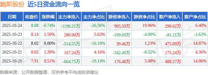 证券之星消息,截至2025年10月24日收盘,鲍斯股份(300441)报收于8.08元,下跌0.74%,换手率0.89%,成交量5.61万手,成交额4537.75万元。