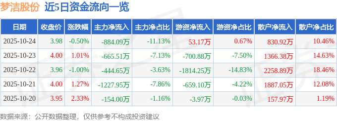10月24日的资金流向数据方面,主力资金净流出884.09万元,占总成交额11.13%,游资资金净流入53.17万元,占总成交额0.67%,散户资金净流入830.92万元,占总成交额10.46%。