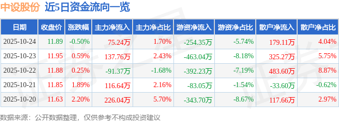 证券之星消息,截至2025年10月24日收盘,中设股份(002883)报收于11.89元,下跌0.5%,换手率2.43%,成交量3.73万手,成交额4432.83万元。